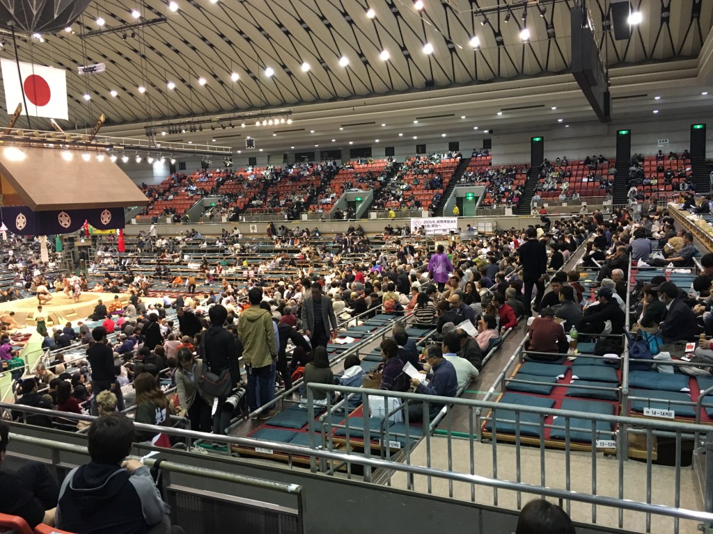 When I heard of the grand sumo tournament happening in Osaka I thought I needed to get tickets. They were sold out online so the only way was for me to get up early in the morning (five a.m.) and queue hoping for a ticket. And it worked!